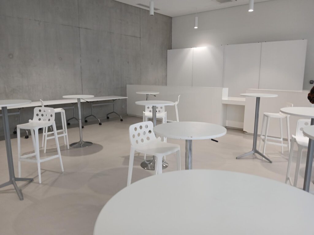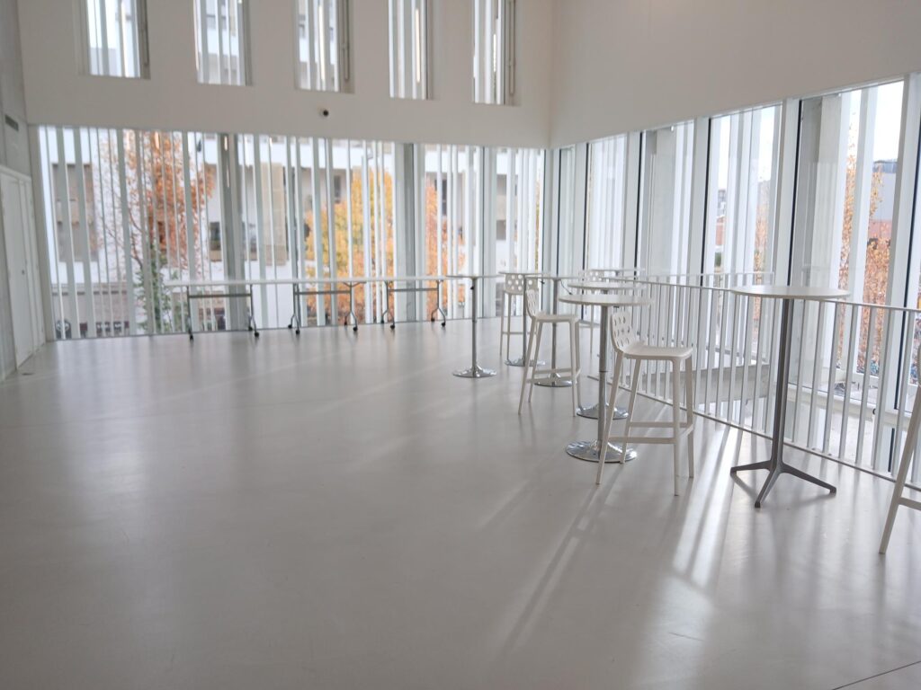 8h30 le vendredi 28 novembre 2025 : un accueil café est prévu sur la mezzanine du 1er étage (photo 1) + dans le foyer du RDC (photo 2).